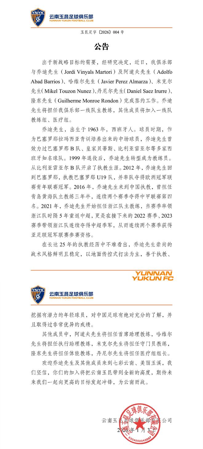 刚刚,云南玉昆在俱乐部官方社交账号上发布公告,称俱乐部于近日与乔迪及其教练组成员完成签约,乔迪将担任俱乐部一线队主教练。