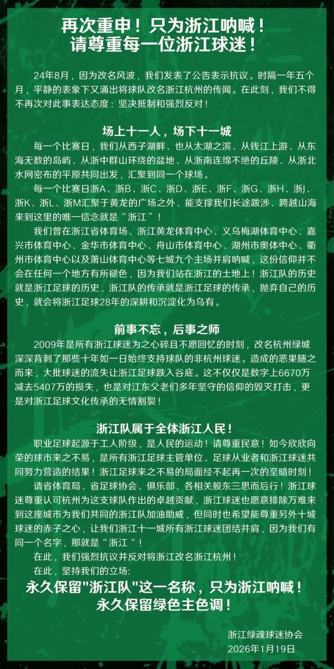 近日,有消息称中超劲旅浙江队,新赛季将更名为“浙江杭州队”。而北京时间1月19日晚,浙江队知名球迷组织“绿魂”发文以示抗议。