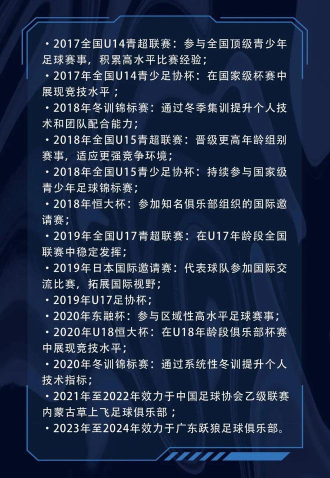 他成长于广州恒大足球学校,接受系统职业训练,基本功扎实,战术理解力强。球员在青少年时期便多次征战全国U系列赛事及国际邀请赛,积累了丰富的比赛经验,具备出色的速度、突破能力与门前意识,能在高强度对抗中稳定发挥,胜任前场多个位置。